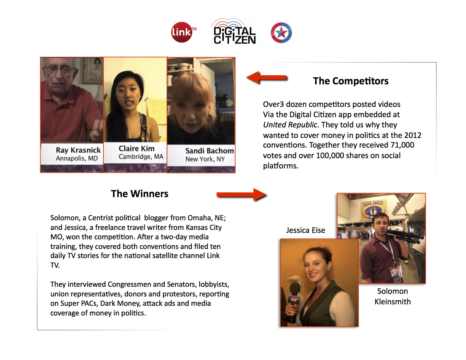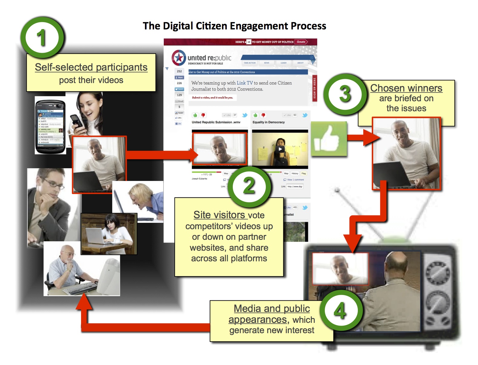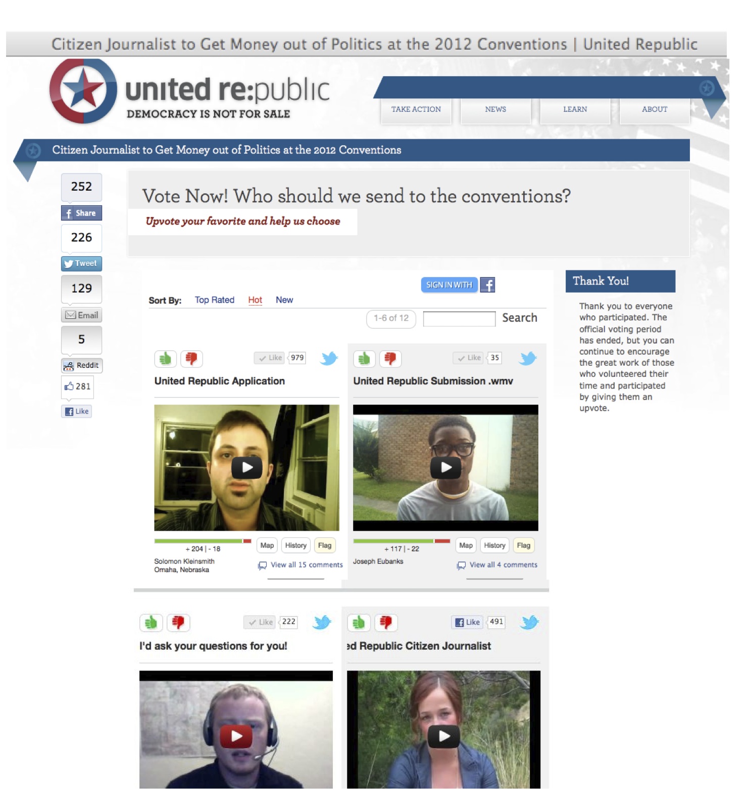 The app can be embedded on any website, allowing people to express their thoughts, watch and vote on the comments of others, and share across all social platforms. UnitedRepublic.org embedded an offer to send “citizen reporters” to the 2012 political conventions with the satellite channel Link TV to cover money in politics: